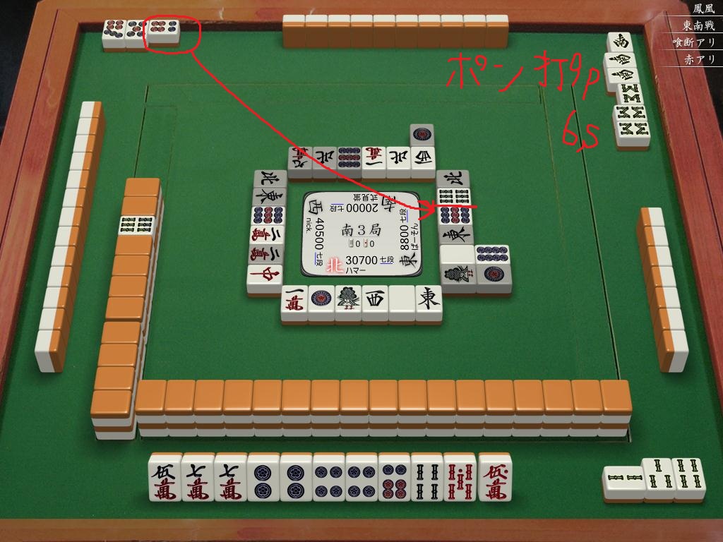 下家は 南ポン 打9p、次巡 6pツモ切り、8sポン 打6s としています。